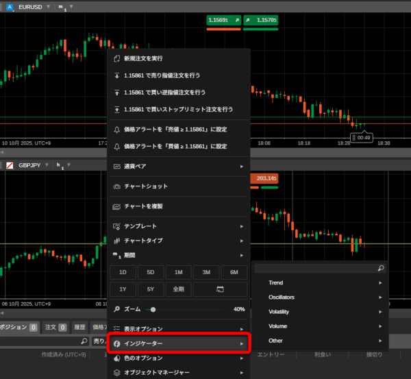 また、チャートタイプ・時間足・インディケータ・描画オブジェクトは、全てチャートの左右にあるメニューバーから呼び出せるので楽チンですよ。