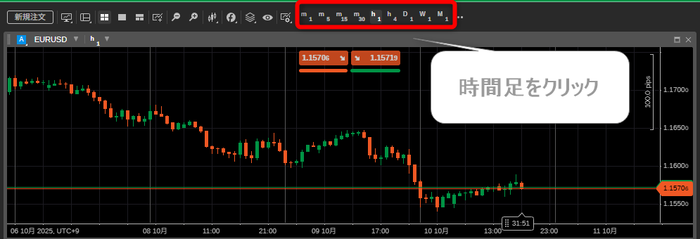 また、チャートタイプ・時間足・描画オブジェクトなどは、画面上部のツールバーに集約されているところもcTraderとは違いますね。