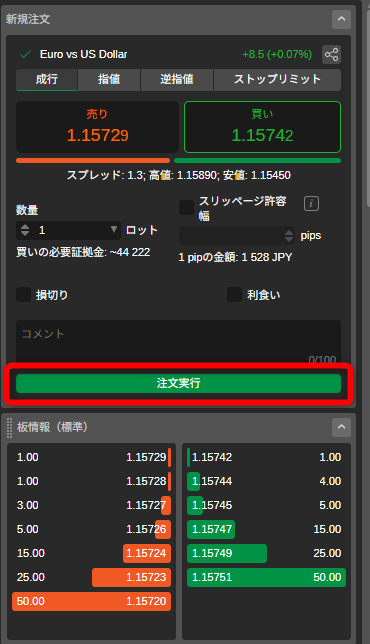 取引数量を指定し、Sell・Buyをクリックするだけで成行注文が可能です。