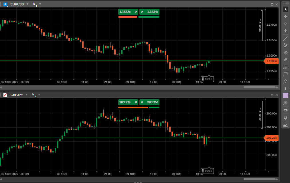 | 通貨ペアリストと ティックチャート | 銘柄選択 新規注文など |