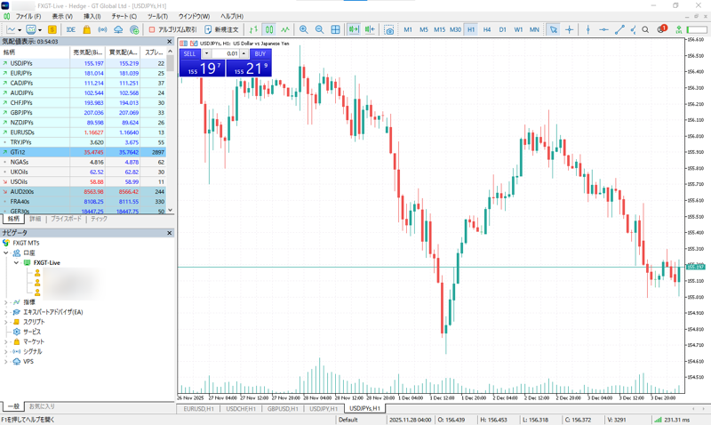 ターミナルに先ほどの注文内容が追加され、右端にリアルタイムの損益が表示されます。