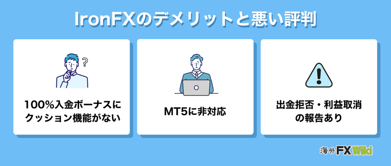 MT5非対応、ボーナス運用ルールが複雑、日本語サポートが夜間非対応、過去のトラブル報道が残っている点です。