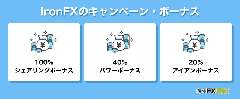 入金額と同額のボーナスが付与されるキャンペーンです。上限はなく何度でも利用できます。ただし、クッション機能はなく、損失補填には使えません。また、残高はユーザーとIronFXで半分ずつ共有されるため、利益は半分しか出金できません。ボーナス自体は出金不可で、有効期限は30カ月です。最低入金額の指定はありません。対象は新規口座開設と追加口座開設です。>>詳細はこちら