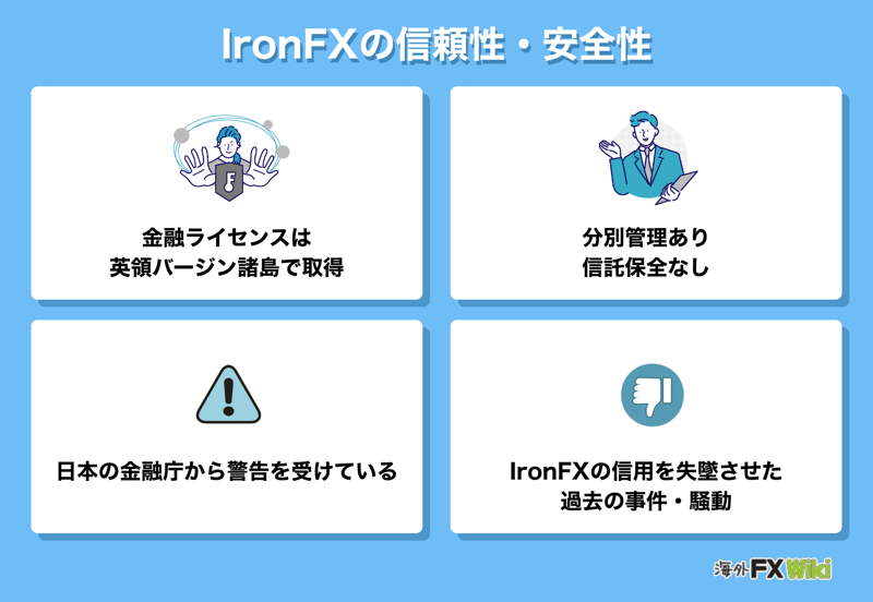 ここでは、IronFXの運営体制、金融ライセンスの有無、会社沿革、資金管理体制、日本国内での法規制対応など、信頼性や安全性に関する重要なポイントを詳しく解説します。
