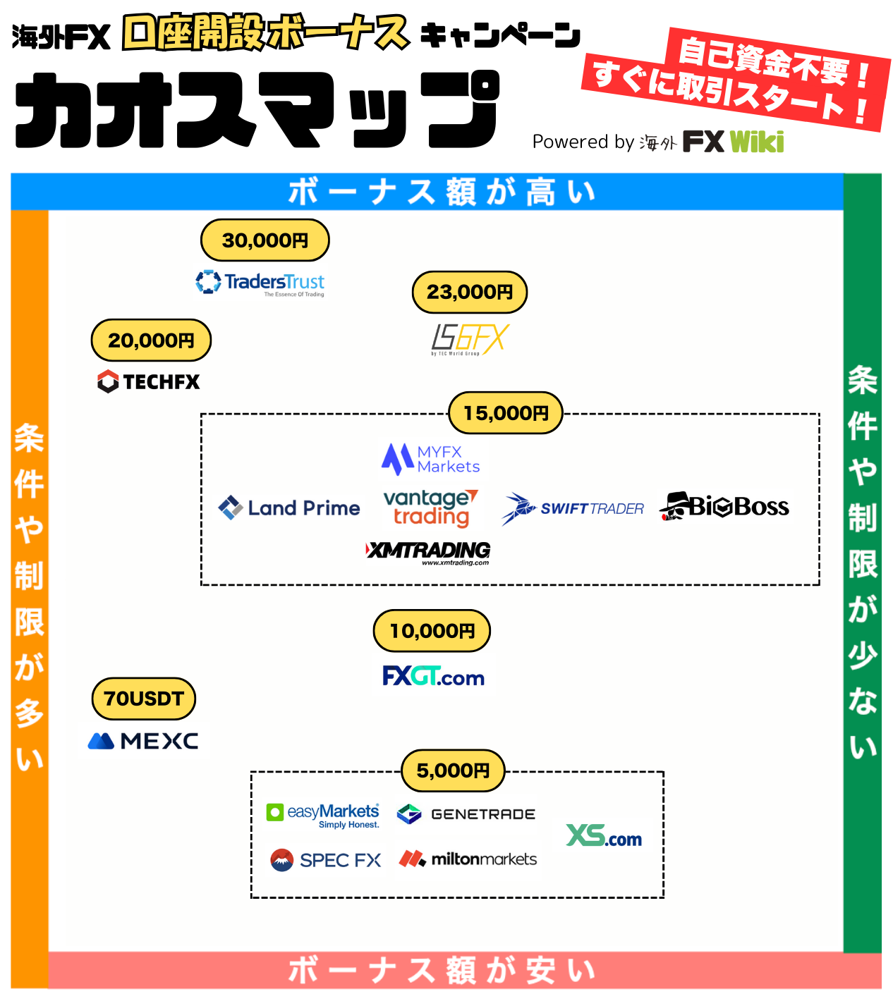 上記は、海外FX業者の口座開設ボーナスを、ボーナス額と利益出金条件や取引制限の厳しさで大まかに分類したものです。