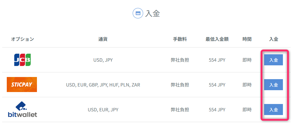 Exnessはさらに幅広く、VISA・JCB・bitwallet・STICPAYに加え、TigerPay、さらにはBTCやUSDTなどの暗号資産入出金にも対応しています。