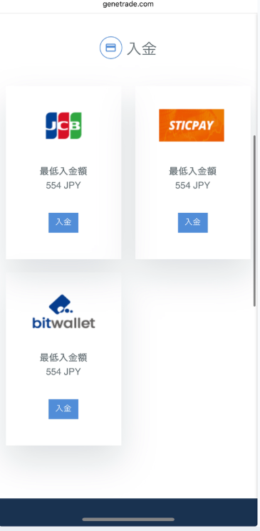GeneTradeはJCBカードとbitwalletに対応しており、最低限の手段は備えていますが、選択肢はやや限られています。
