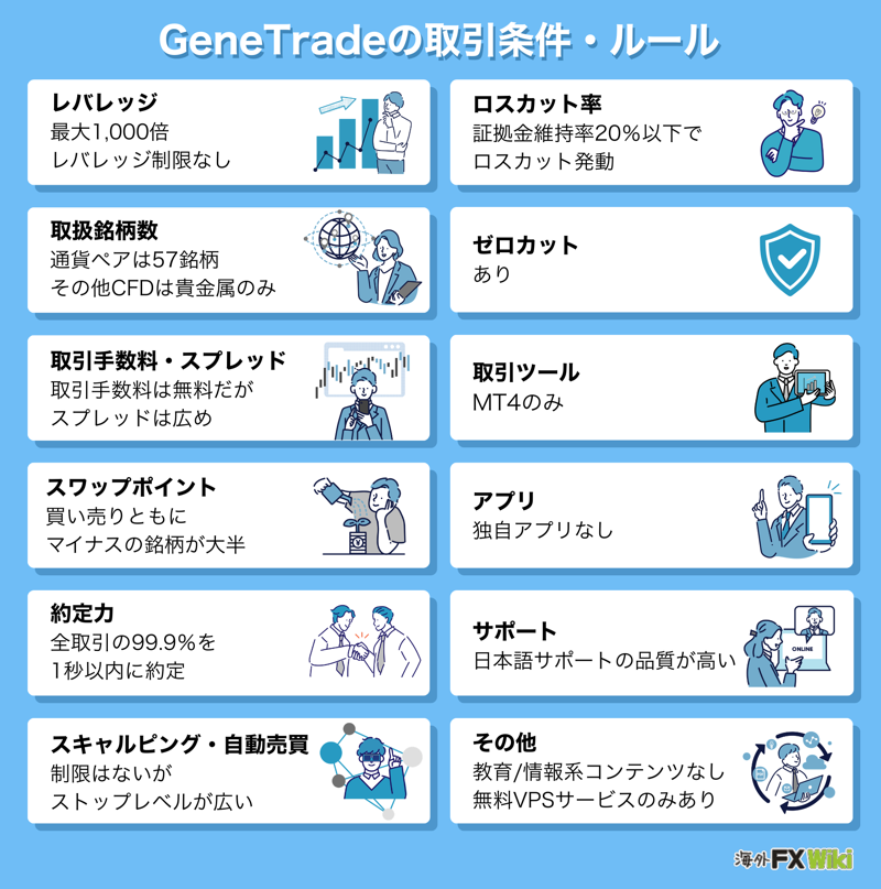 GeneTradeは、最大レバレッジ1,000倍、有効証拠金によるレバレッジ制限なし、常時開催している口座開設ボーナスと入金ボーナスなどが特徴の、比較的マイナーな海外FX業者です。
