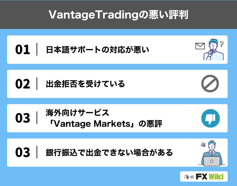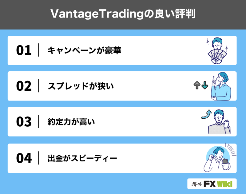 結論から言うと、VantageTradingの評判は「キャンペーンやスプレッド、約定力の高さに魅力がある一方で、サポート体制や出金トラブルに不安を感じる声も多い」とった印象です。