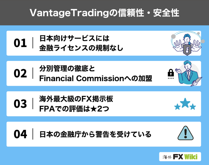 ここでは、Vantage Tradingの信頼性・安全性を4つの観点から解説します。