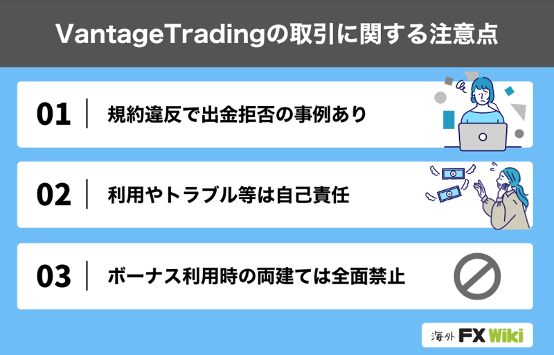 トレーダーの口座資金はVantage Tradingの運営資金とは明確に分別管理されますが、信託保全制度は導入していないため、万が一Vantage Tradingが破綻した際は預けた資金が全額返還される保証はありません。