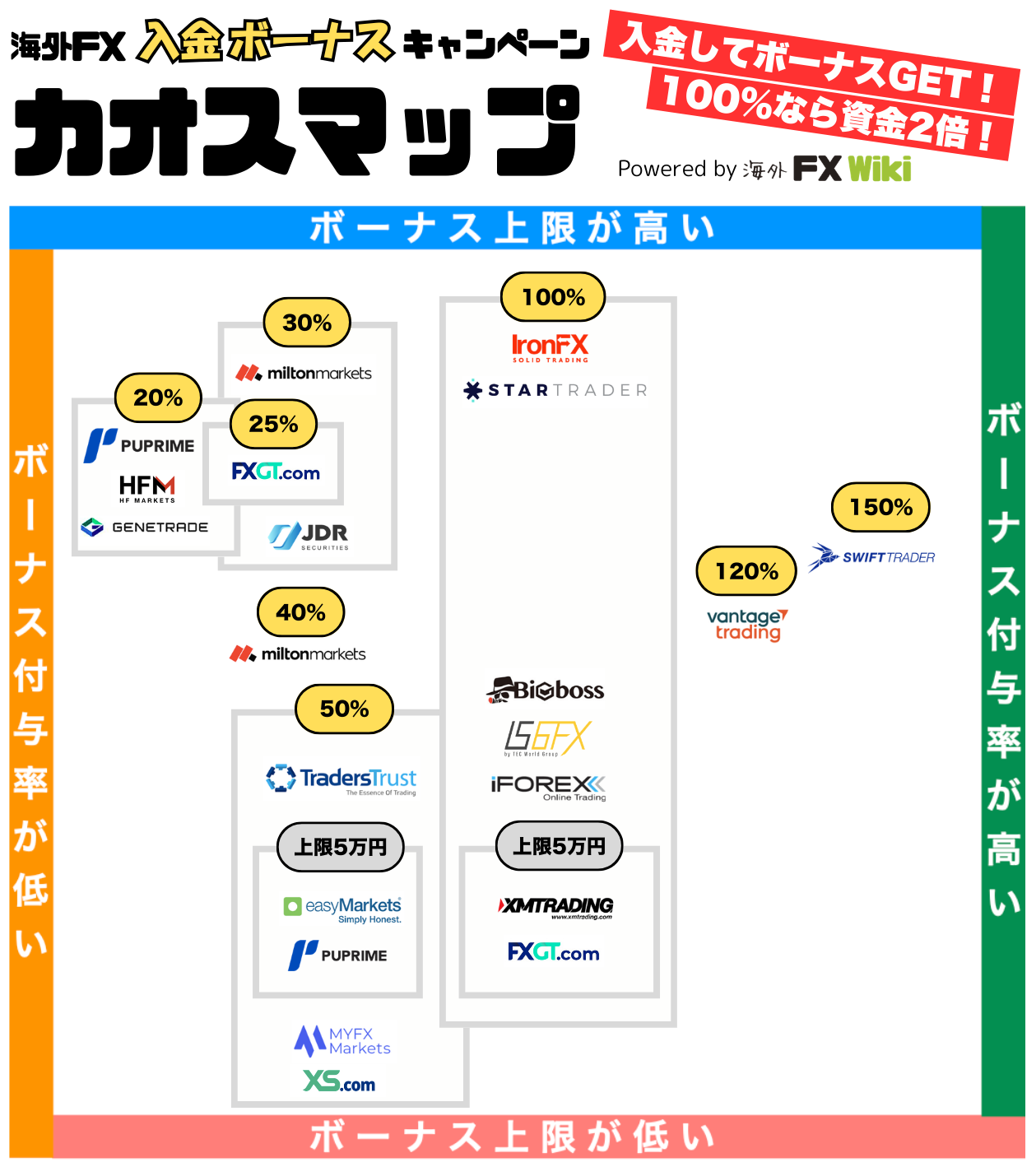 現在は、上限5万円の100%入金ボーナスが最も多く提供されており、海外FX業者の入金ボーナスを検討する際のベンチマークとして考えることが可能です。