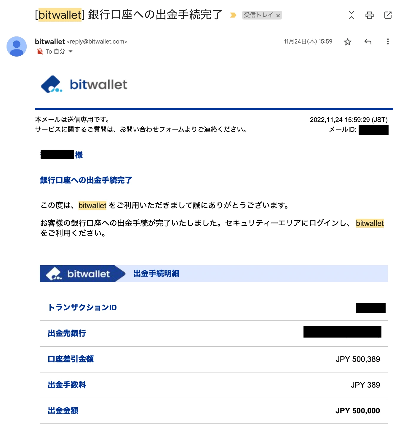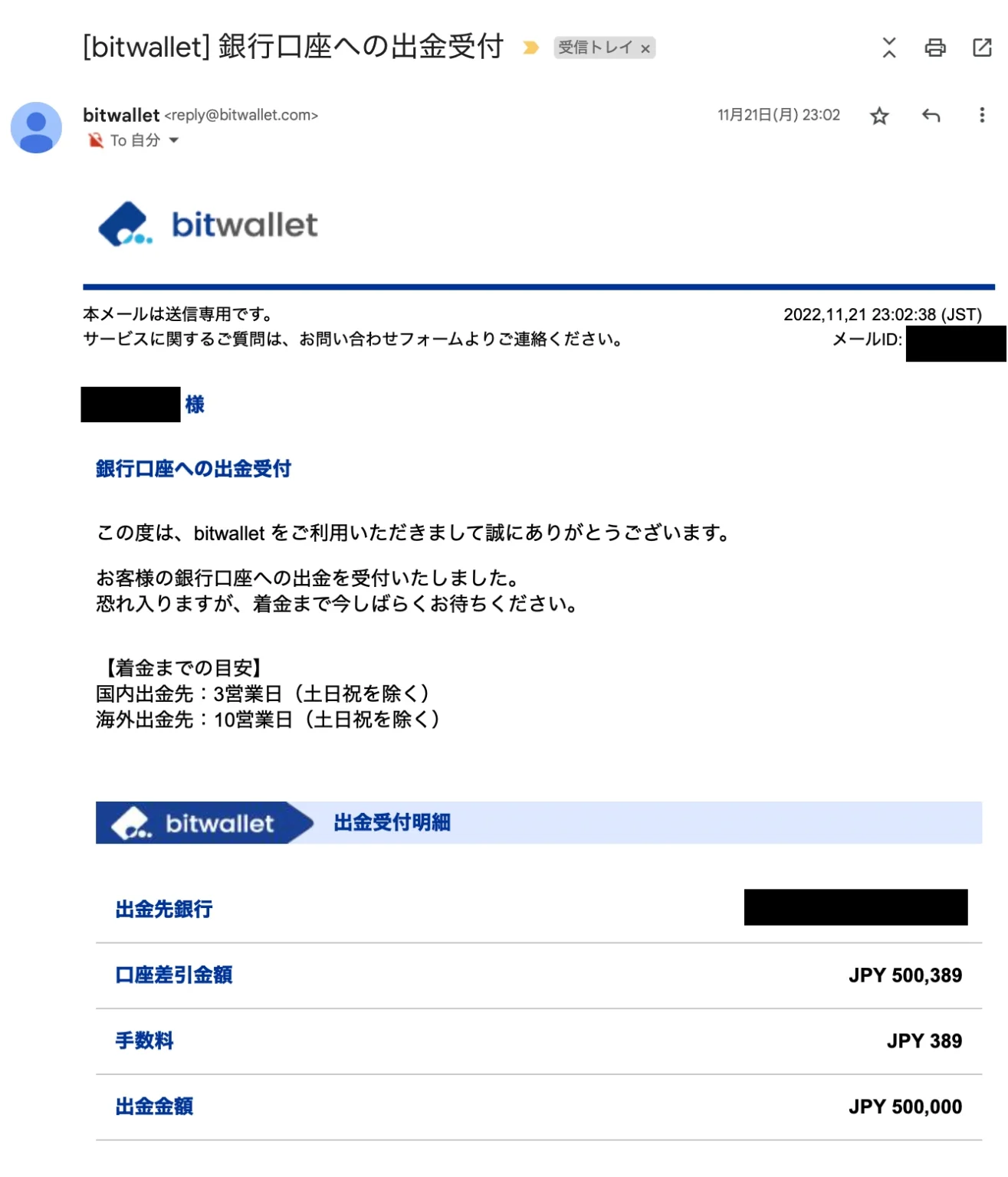 3日後の2022年11月24日に出金手続き完了のメールが到着しました。