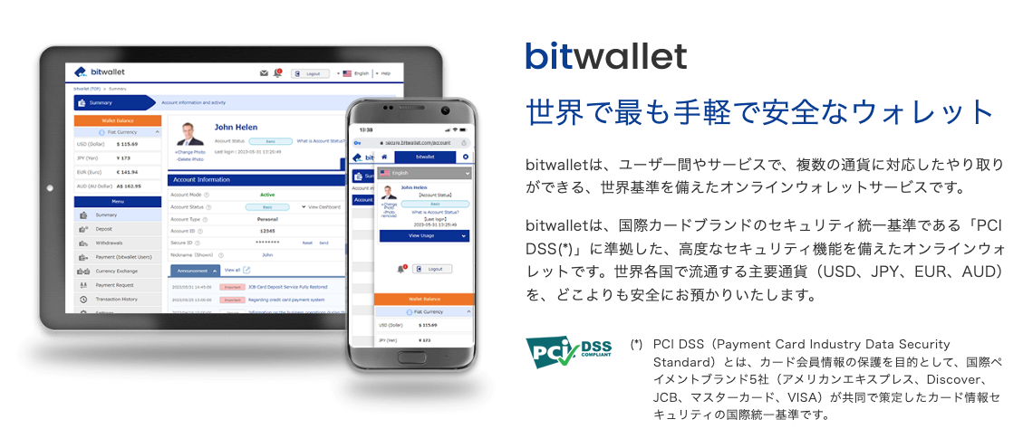 bitwalletとは、法定通貨(日本円・米ドル・ユーロ・豪ドルなど)を安全に管理できる、優れたセキュリティ機能を備えたデジタルウォレットです。