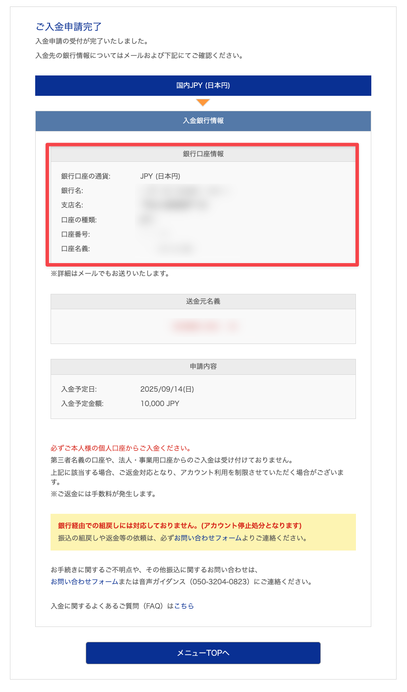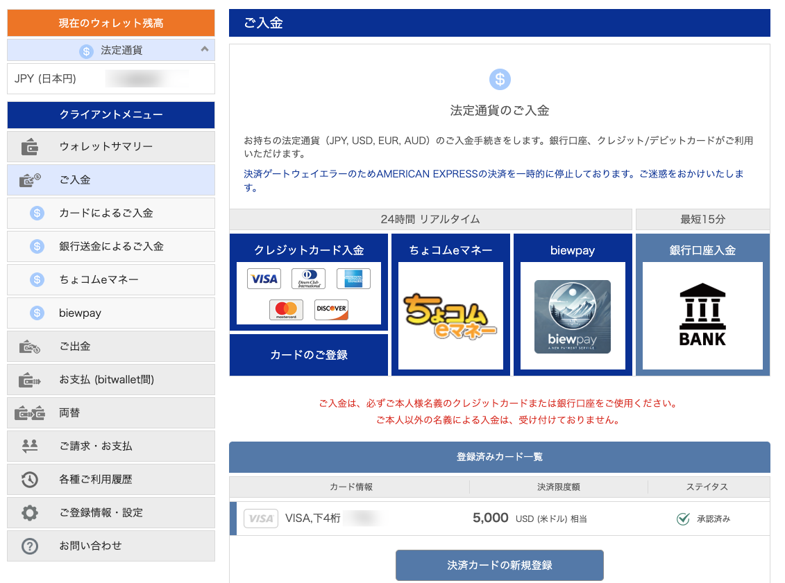 - クレジットカード入金は手数料が高く緊急時以外は非推奨