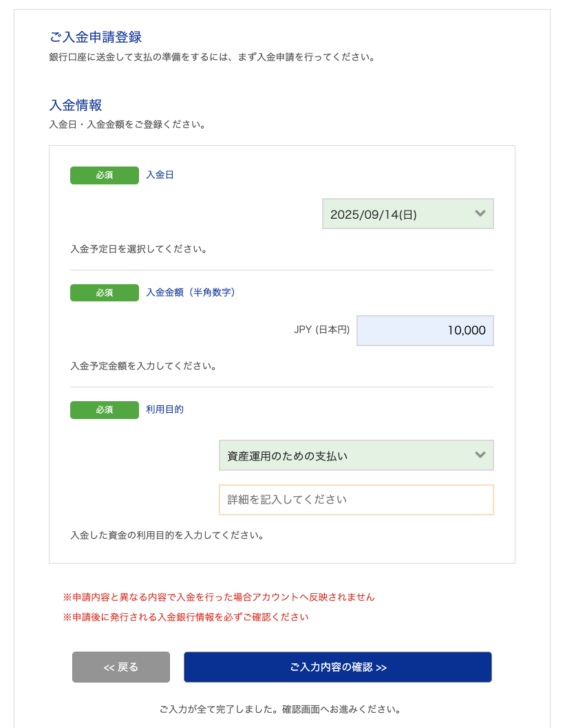 入金日・入金額・利用目的を選択または入力し、ご入力内容の確認>>