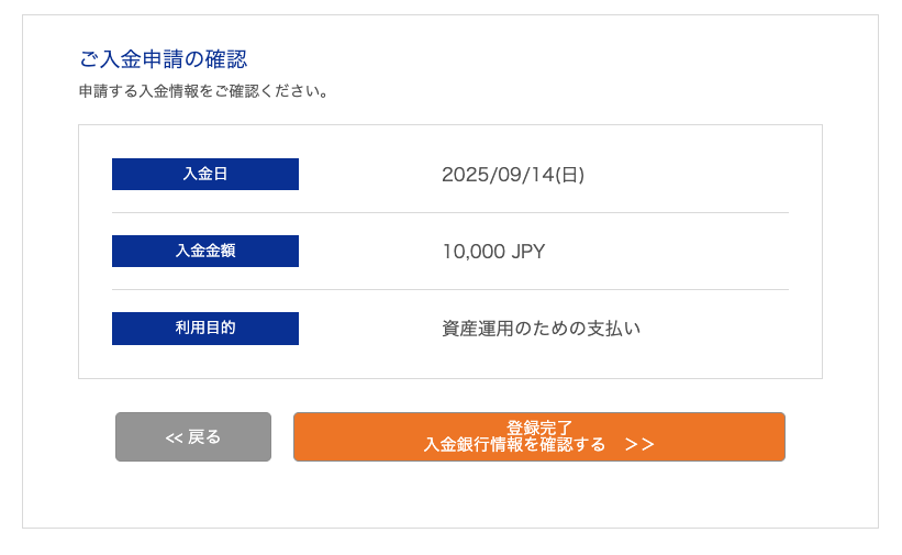 確認画面が表示されるので、登録完了 入金銀行情報を確認する>>