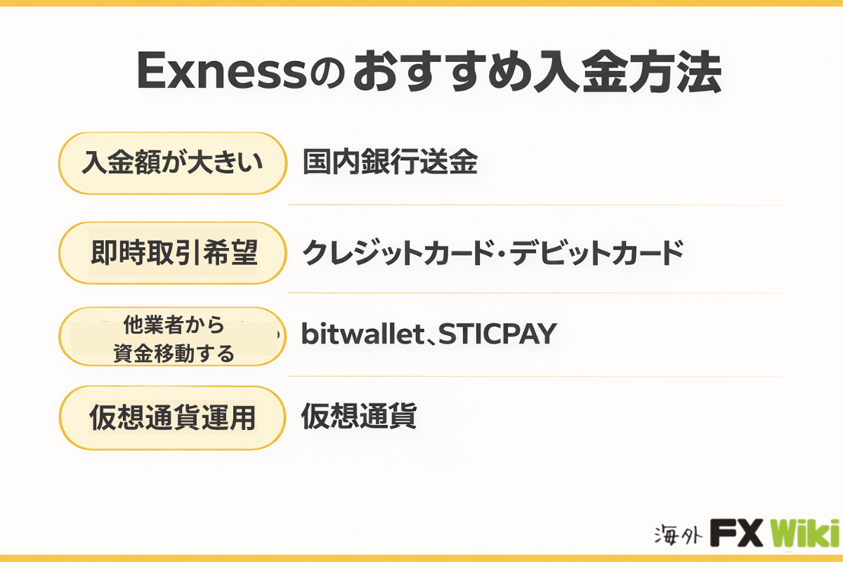 - Exnessは複数の入金方法に対応しており、目的に合わせて使い分けることが重要