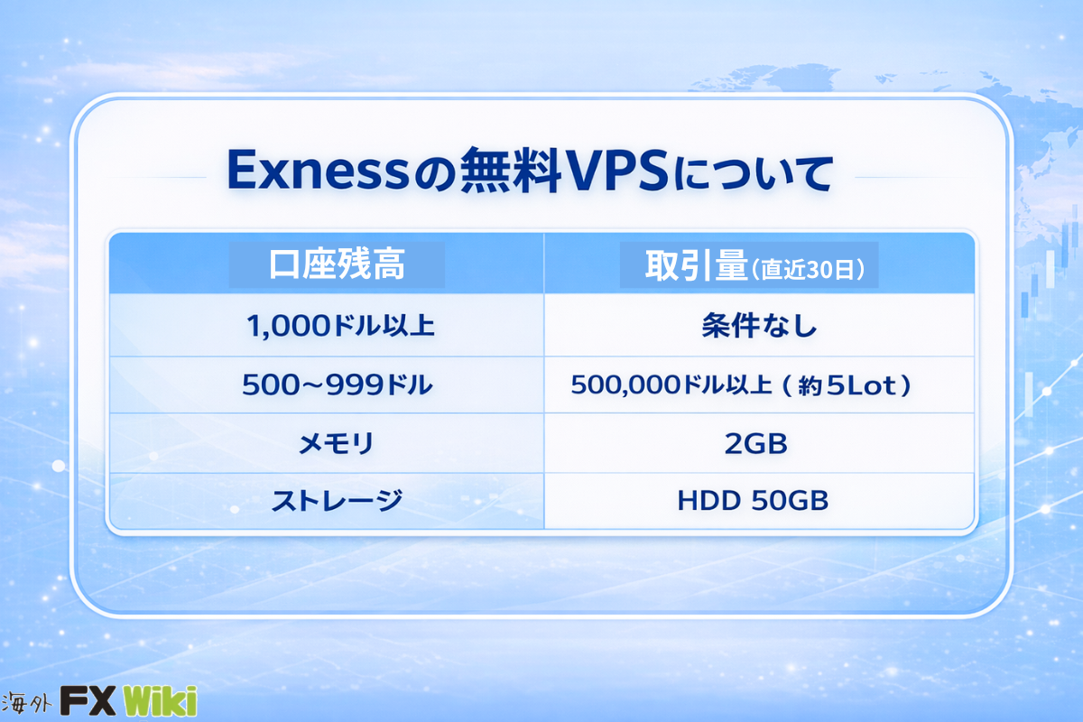 - Exnessのアクティブ口座の合計残高が1,000ドル以上あるとVPSを無料で利用できる