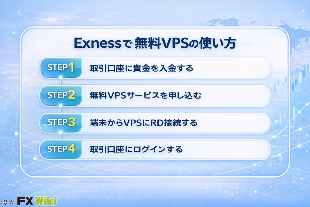 ここでは、Exnessで無料VPSの使い方・設定手順を4つのステップに分けてわかりやすく解説します。