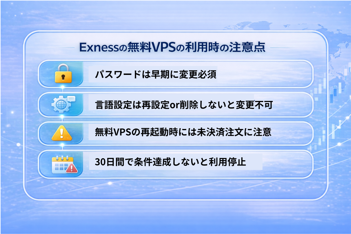 Exnessの無料VPSは便利ですが、いくつか注意点があります。