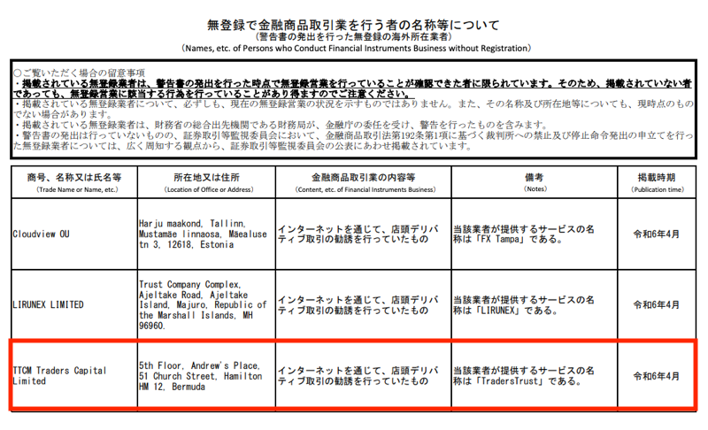 TradersTrustは、日本の金融庁から「無登録で金融商品取引業等を行う者」として警告を受けています。