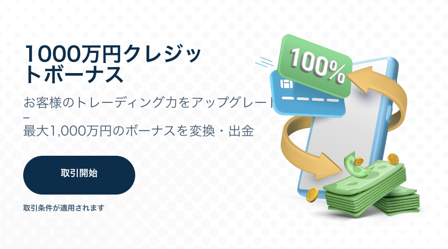 TradersTrustは、「1,000万円クレジットボーナス」と呼ばれる出金可能な100%入金ボーナスキャンペーンを常時開催しています。キャンペーン対象口座はクラシック口座とプロ口座のみで、5万円以上の複数入金に対して出金可能な100%入金ボーナスが上限1,000万円まで獲得できます。獲得したボーナスは、取引0.2ロットあたり100円を出金できる仕組みです。ただし、ボーナス有効期限、ボーナス消滅条件、取引制限には注意。詳細はこちらをご覧ください。