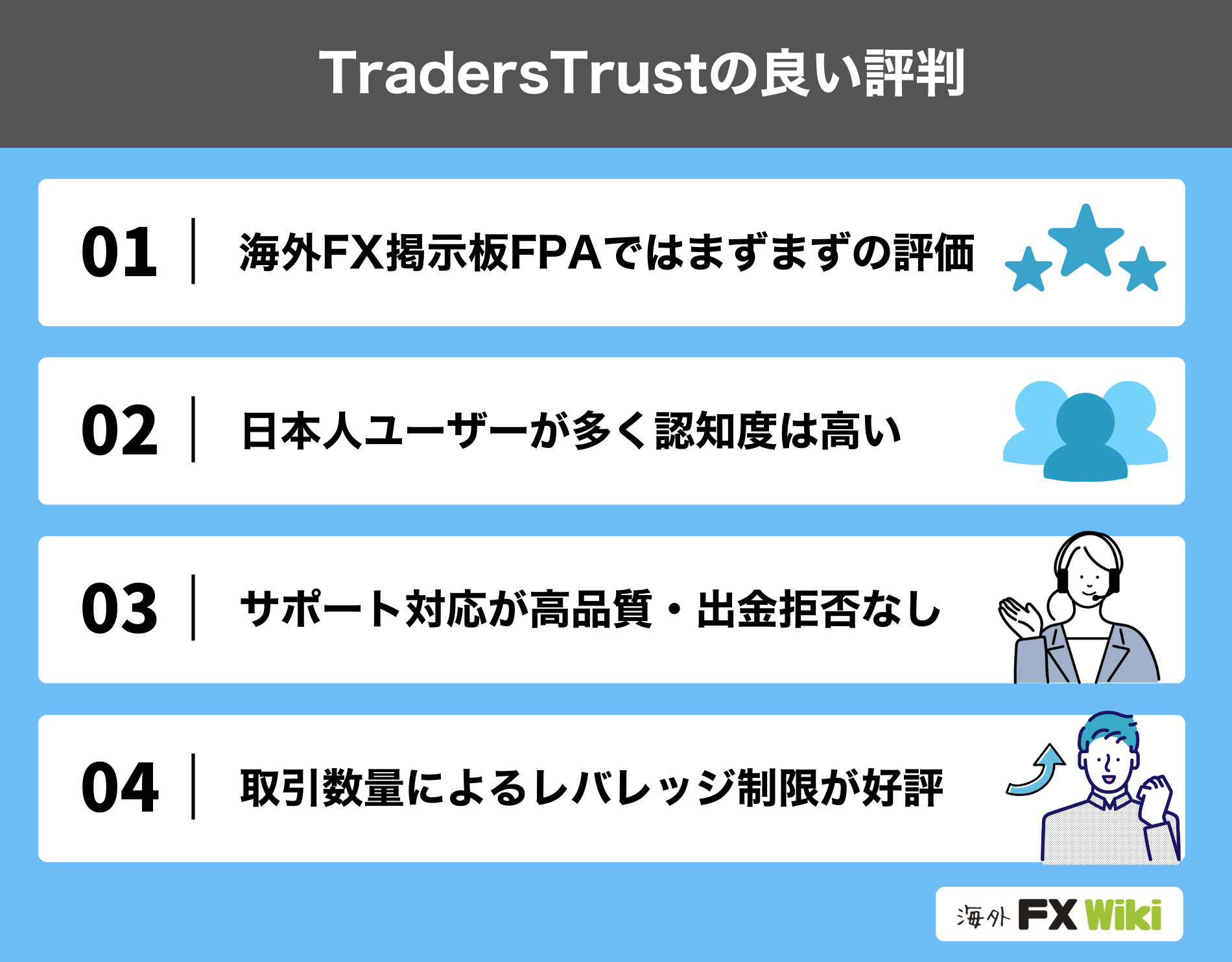 TradersTrustはいくつか課題はあるものの、これまで極端な悪評や大きなトラブルを出さずに安定して運営されている海外FX業者です。