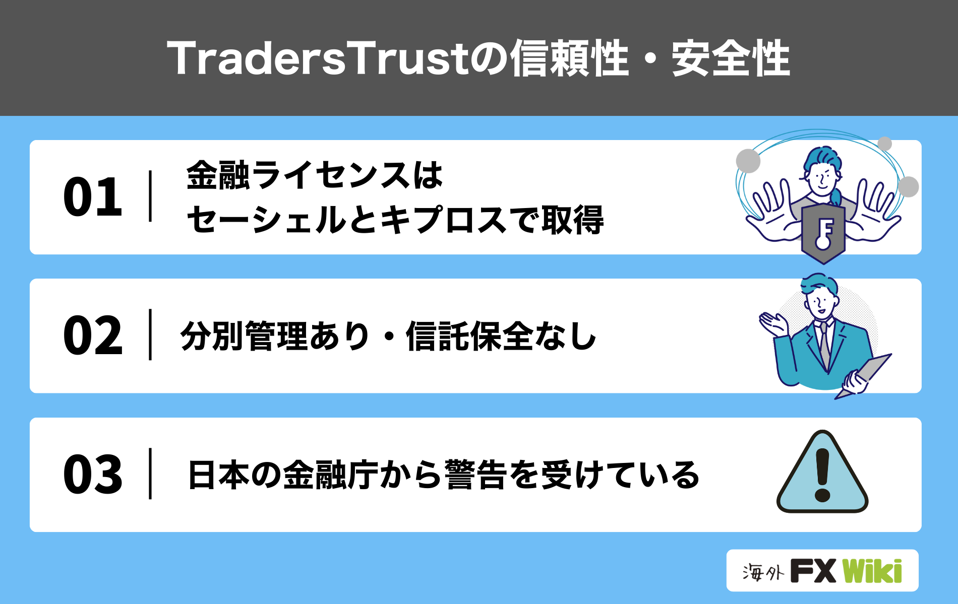 ここでは、TradersTrustの運営体制、金融ライセンスの有無、会社沿革、資金管理体制、日本国内での法規制対応など、信頼性や安全性に関する重要なポイントを詳しく解説します。