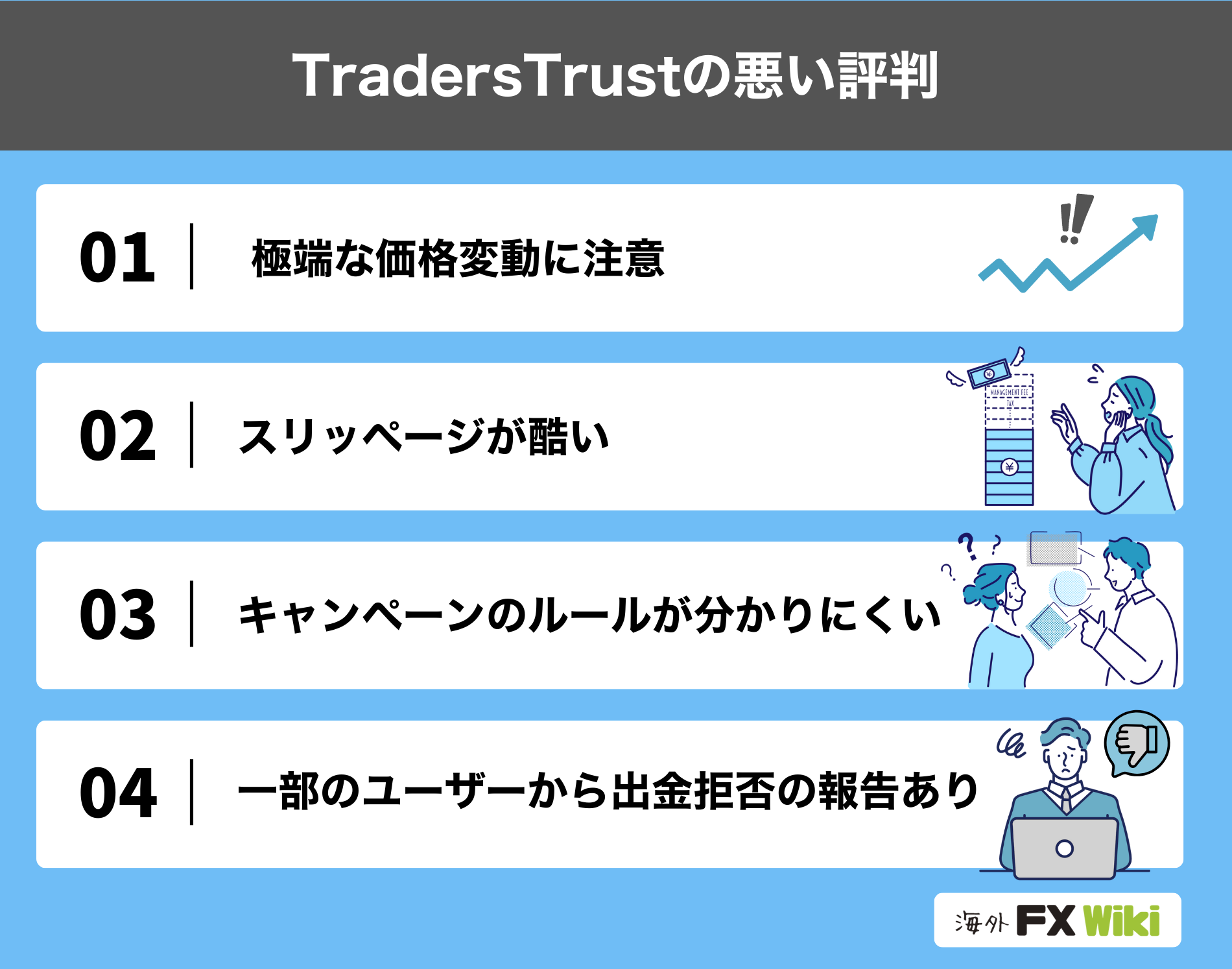 基本的にTradersTrustは出金拒否がない業者として定評がありますが、規約違反や不正取引があった場合は利益取消や出金拒否が発生することがあります。正しく取引すれば、通常は問題ありません。