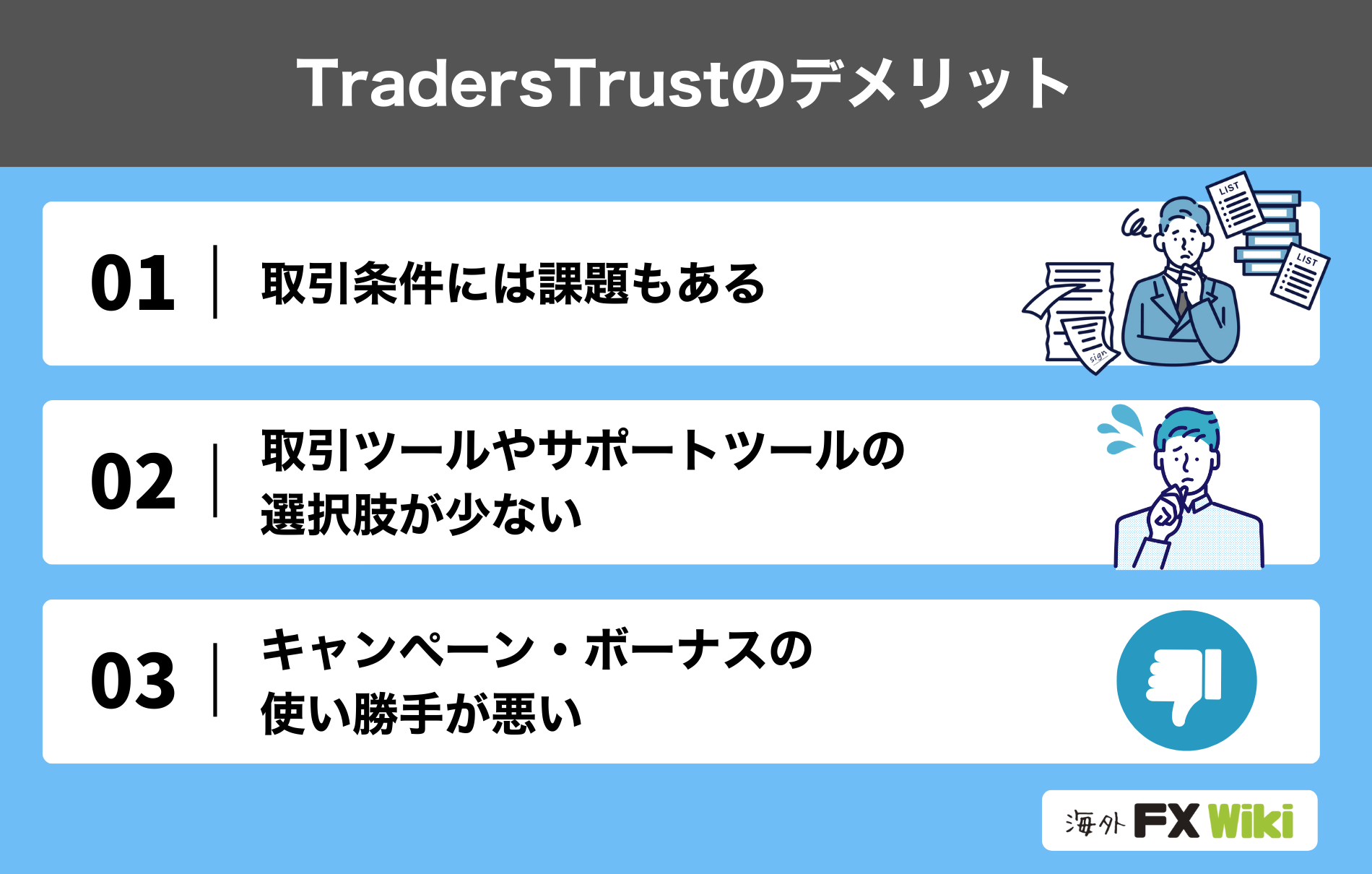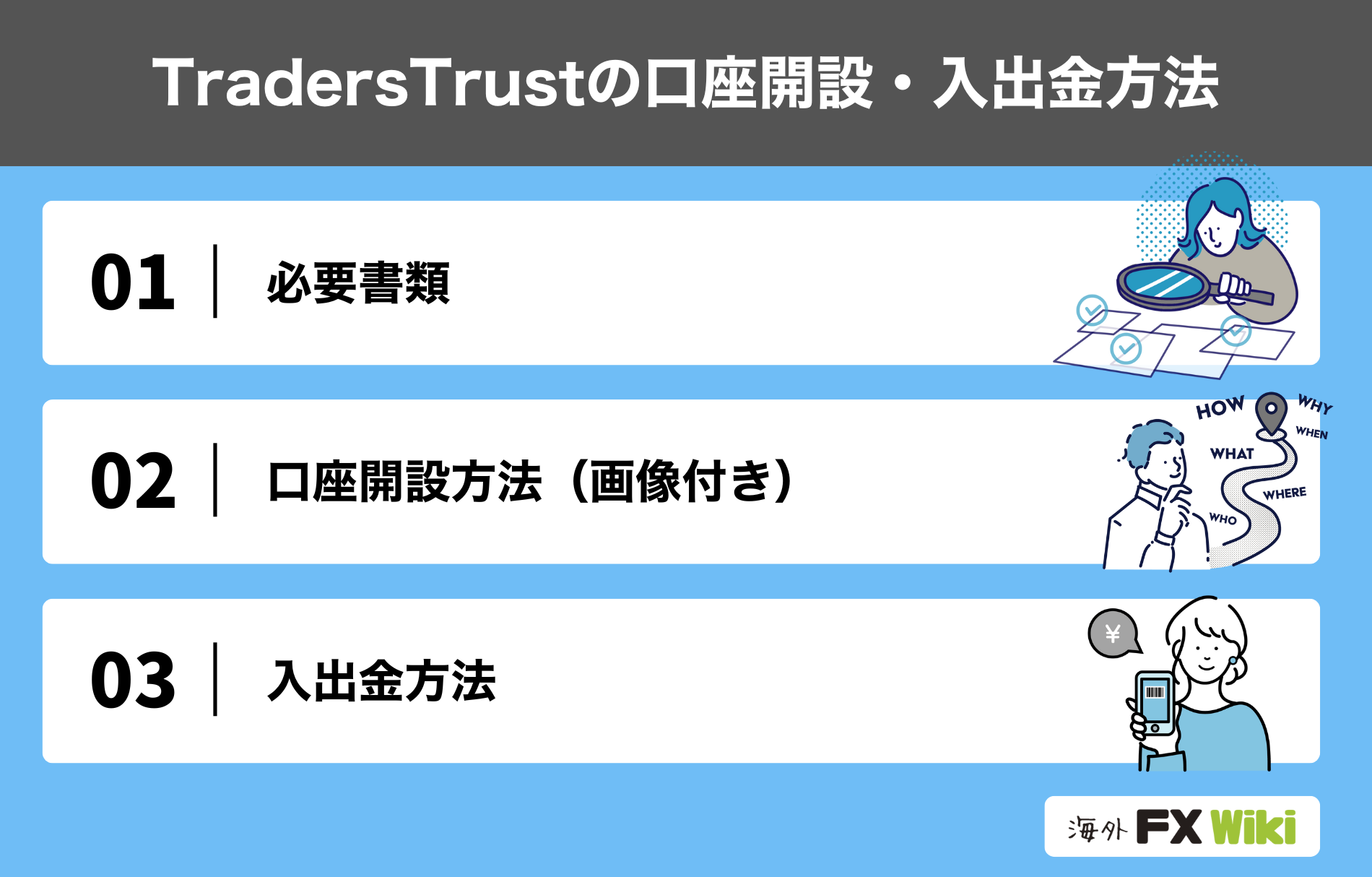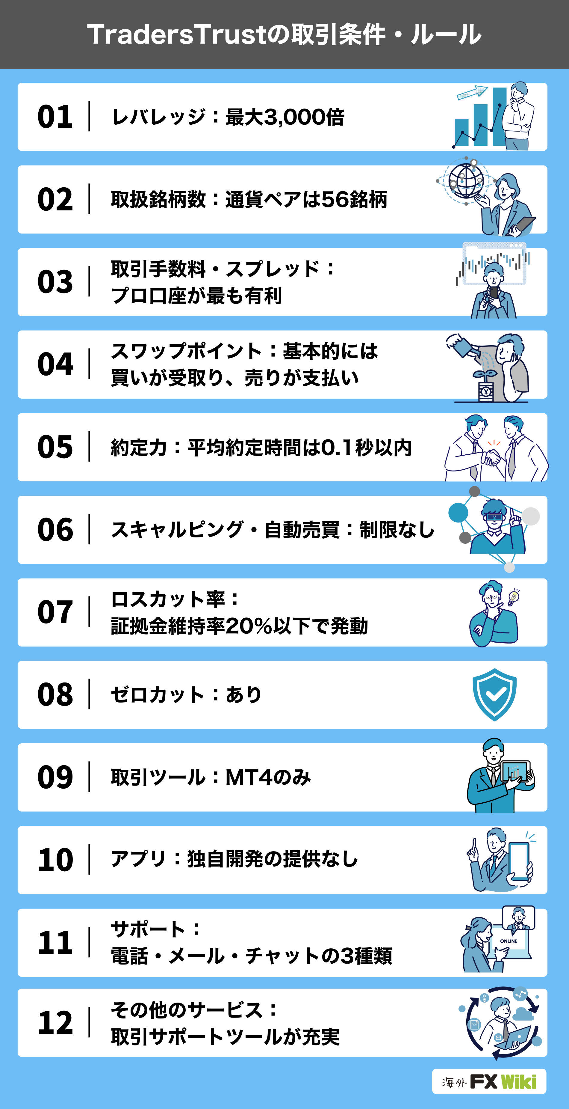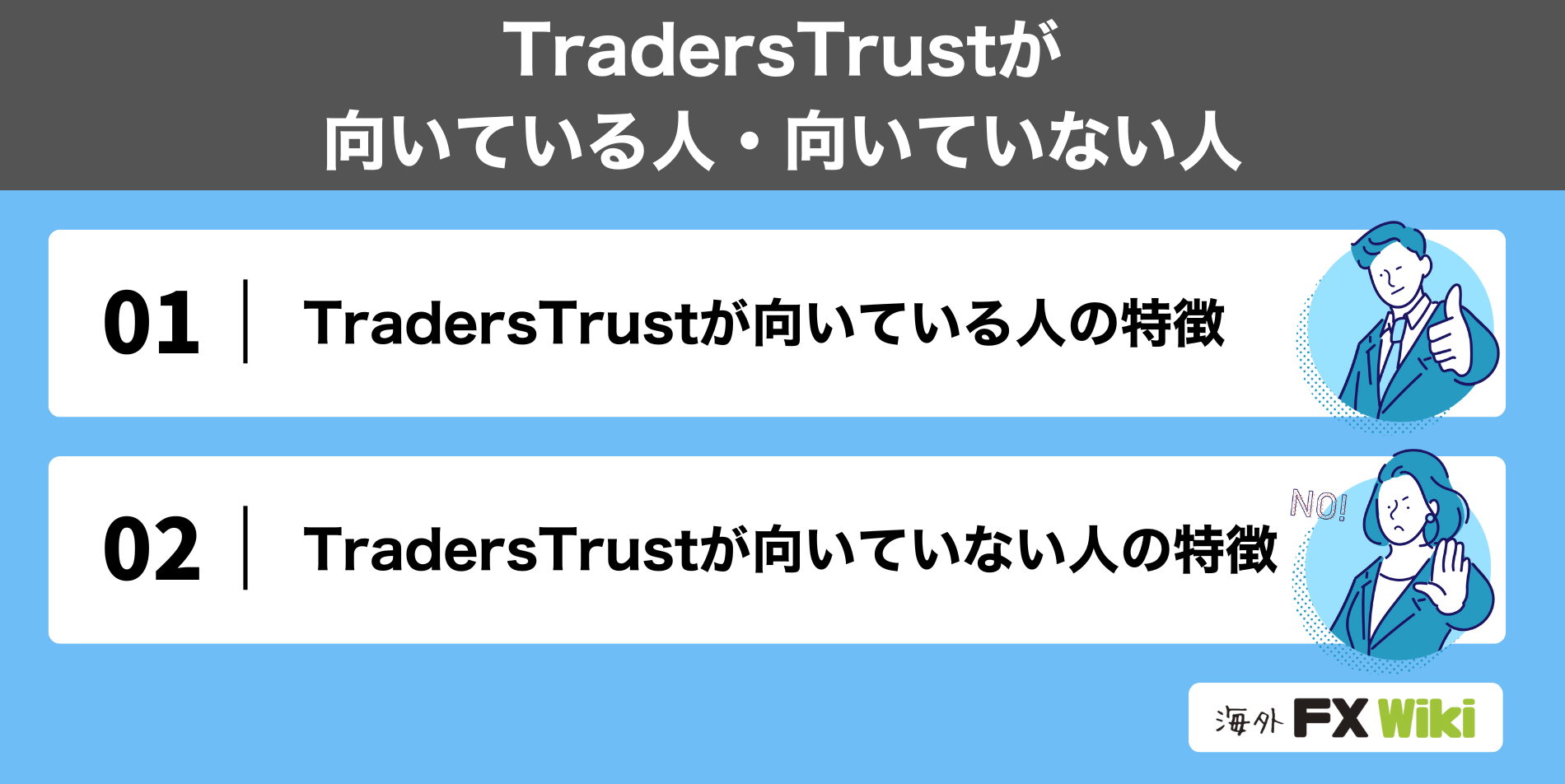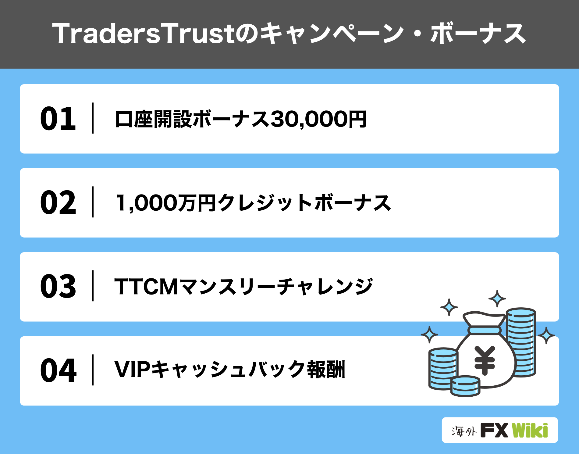 この記事では、TradersTrustの取引条件や評判、最新のキャンペーンや口座開設・入出金方法などを詳しく解説しています。