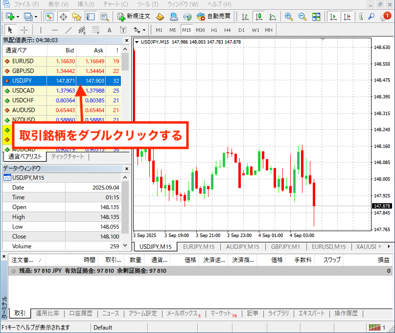 まずは希望の取引銘柄をダブルクリックして、注文画面を開きましょう。