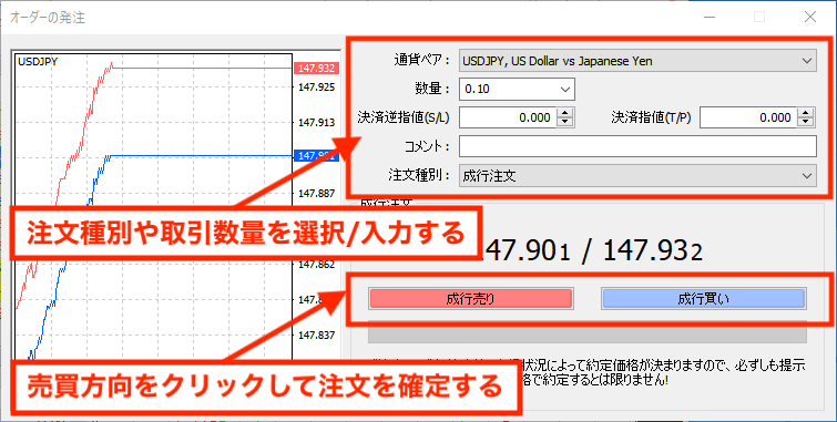 ここでは注文方法を最もシンプルな成行注文で解説しますが、MT4・MT5はさらに複雑な予約注文も可能です。