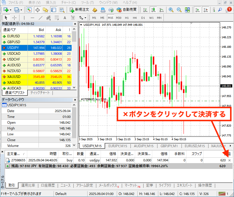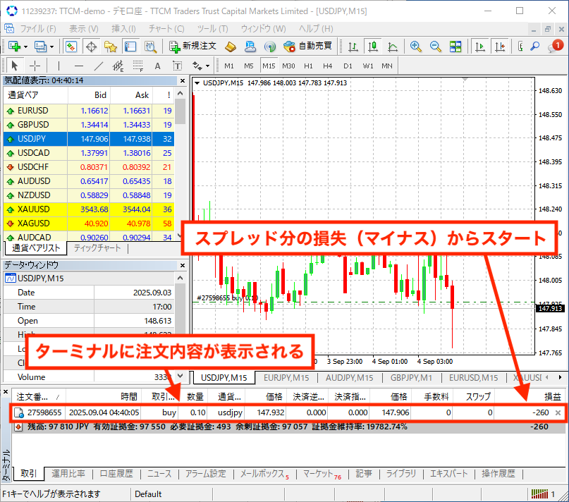 ターミナルに先ほどの注文内容が追加され、右端にリアルタイムの損益が表示されます。