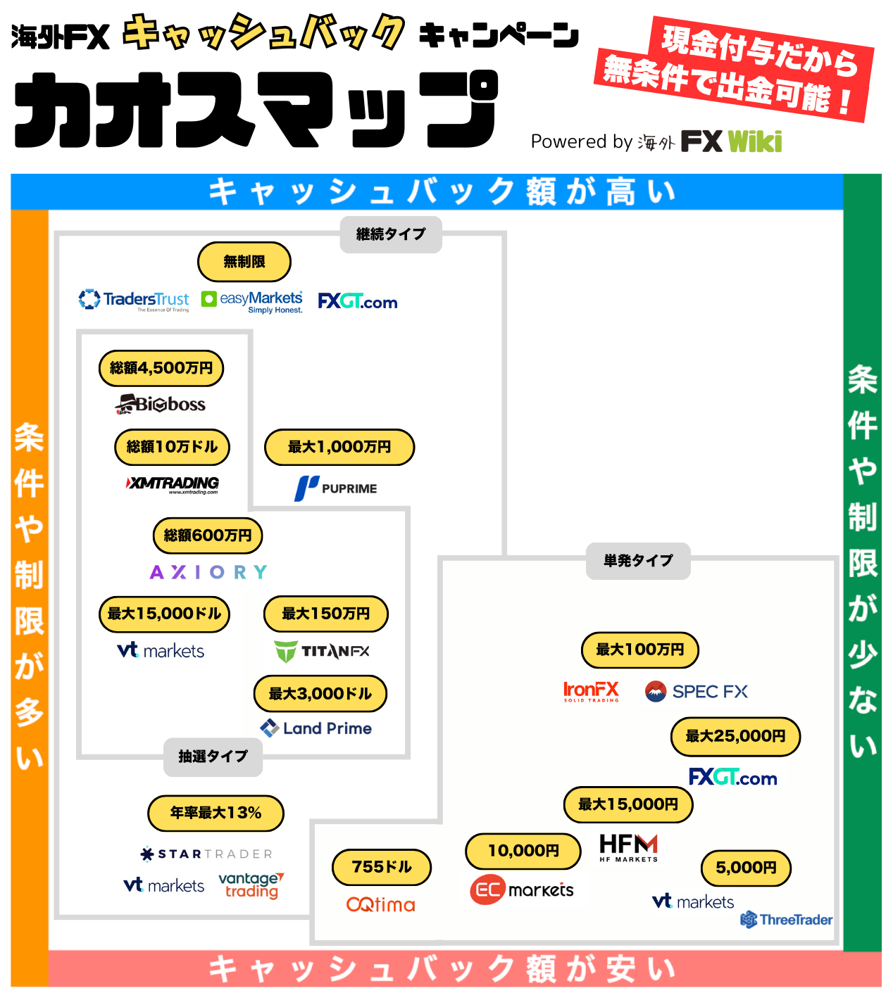 上記は、海外FX業者のキャッシュバックキャンペーンを、キャッシュバック額と獲得条件や取引制限の厳しさで大まかに分類したものです。