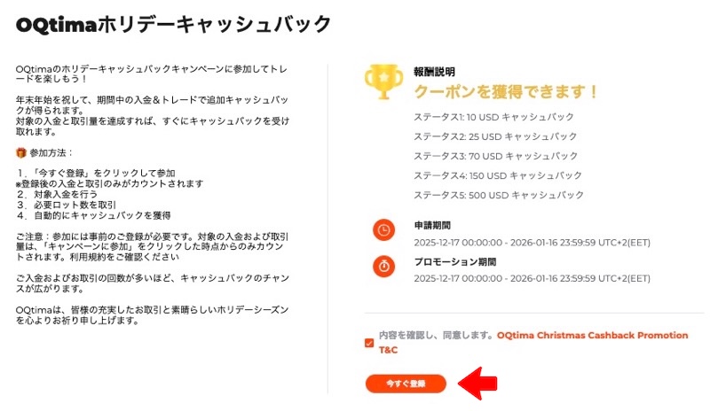 期間限定キャンペーンの場合、終了日までにキャッシュバック獲得条件を達成する必要があります。また、取引コンテストは途中参加が可能なものもありますが、開始日以前に参加申込期限が定められており途中参加できないものもあります。
