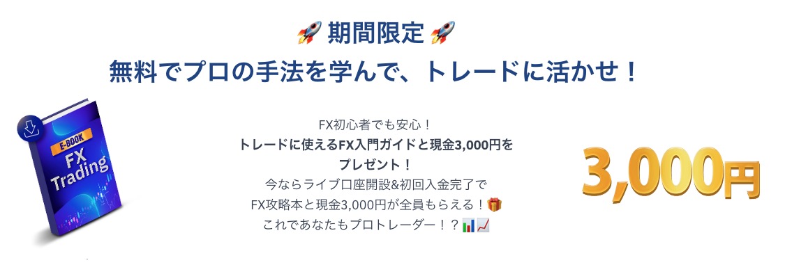 当サイト経由で口座開設をした新規ユーザーは、30,000円以上の初回入金と3スタンダードロットを取引するだけで、もれなく10,000円のキャッシュバックを受け取れます。