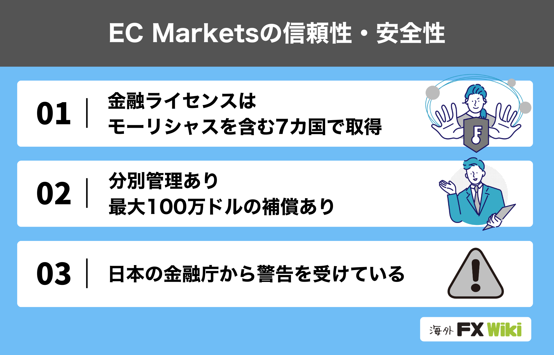 ここでは、EC Marketsの運営体制、金融ライセンスの有無、資金管理体制、日本国内での法規制対応など、信頼性や安全性に関する重要なポイントを詳しく解説します。
