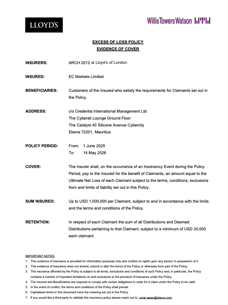 それに加え、EC Markets はARCH 2012のロイズ・オブ・ロンドンの保険に加盟しているため、顧客ごとに最大 100 万ドルを上限に補償を受けられます。