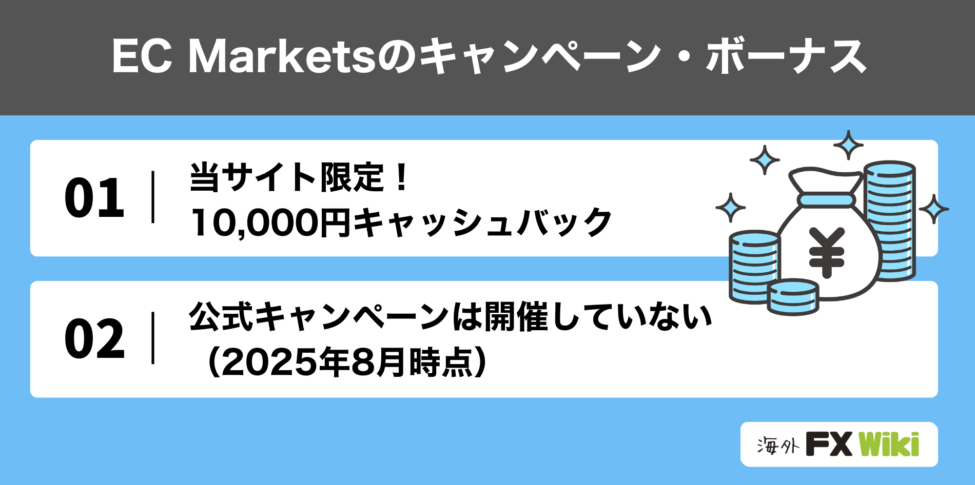 いいえ。現在、EC Marketsでは口座開設ボーナスや入金ボーナスなどのキャンペーンは一切提供されていません。