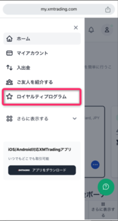 XMのマイページにログインしたら、画面左の上のメニューから「ロイヤリティプログラム」をタップしてください。