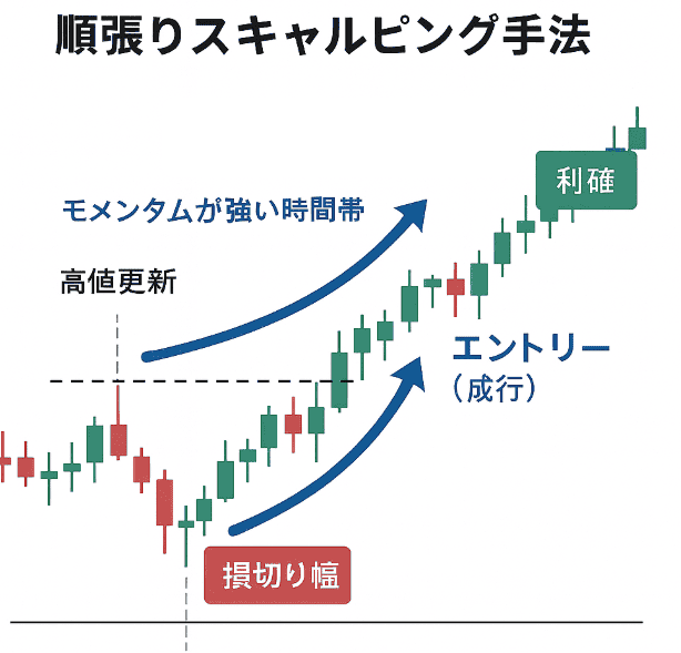 5分足や1分足で高値更新・安値更新のタイミングを狙い、勢いに乗って成行でエントリーするだけでも勝ちやすい場面が多く、初心者でも実践しやすい手法です。