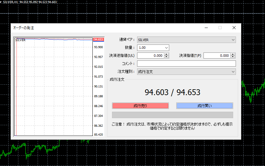 気配値一覧またはチャート上でシルバーを右クリックし、「新規注文」を選択すると注文画面が表示されます。