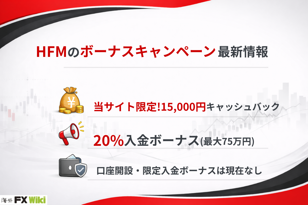 HFMでは、現在、公式の口座開設ボーナスや限定入金ボーナスは実施されていません。