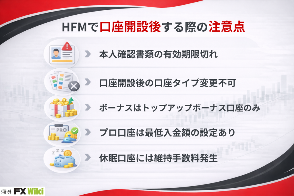 ここでは、HFMで口座開設する際に押さえておきたい注意点を順番に解説します。