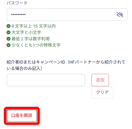 HFMの追加口座は、マイページにログイン後、「追加口座開設(ライブ口座を開設)」から簡単に作成できます。