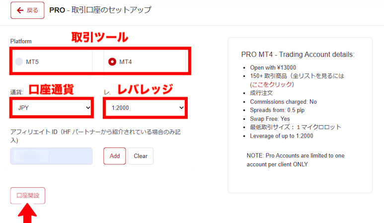 口座タイプや取引プラットフォーム(MT4/MT5)、レバレッジなどを選択するだけで、数分程度で追加口座の開設が完了します。