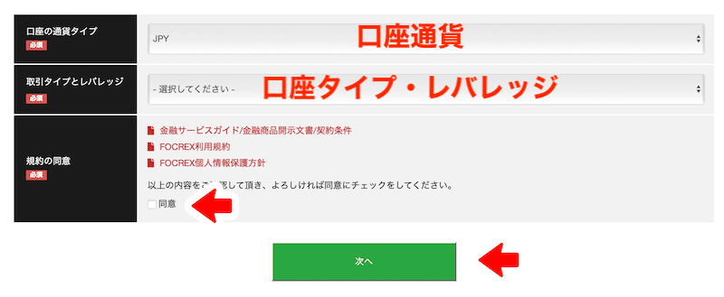 口座通貨・口座タイプ・レバレッジを選択したら、利用規約に同意するチェックを入れ、「次へ」をクリックしましょう。