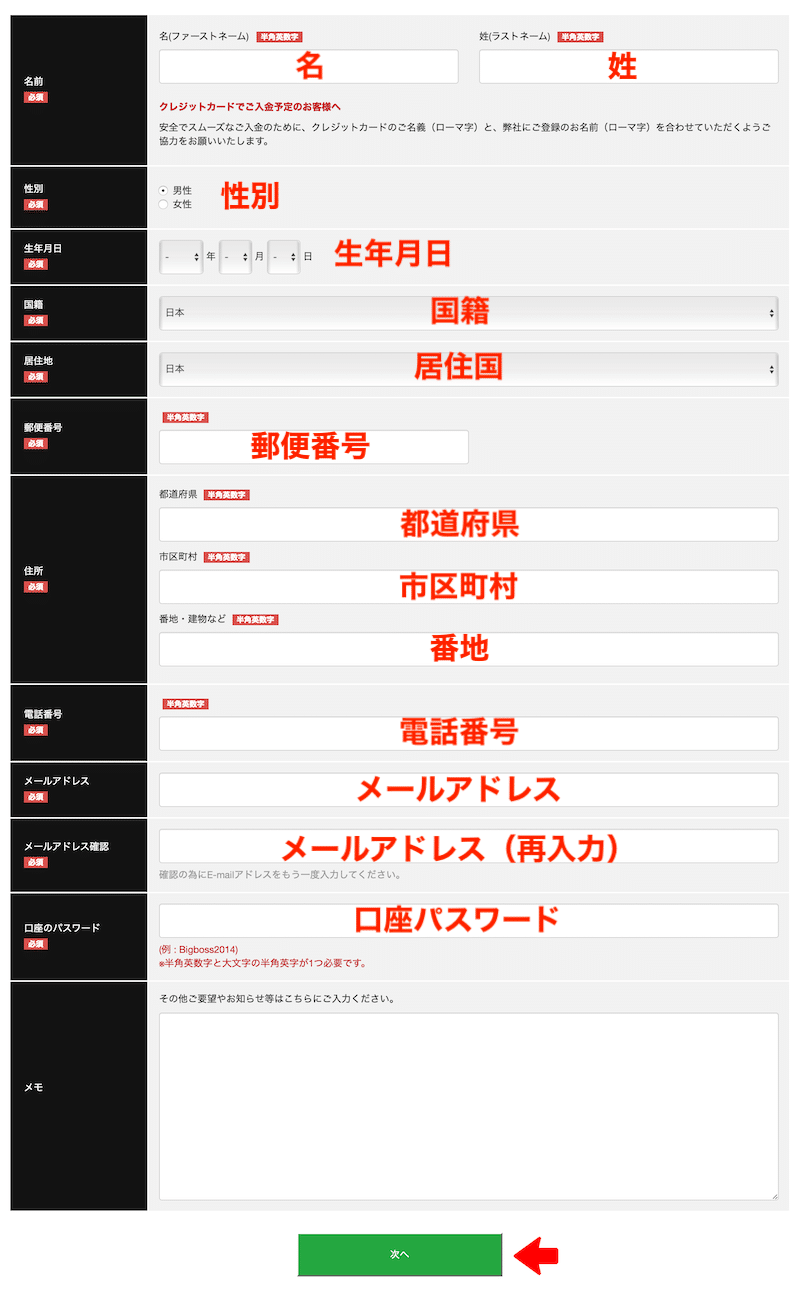 BigBossの口座開設ページへアクセスしたら、フォームに沿って必要情報を順番に入力していきます。