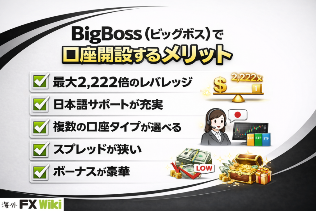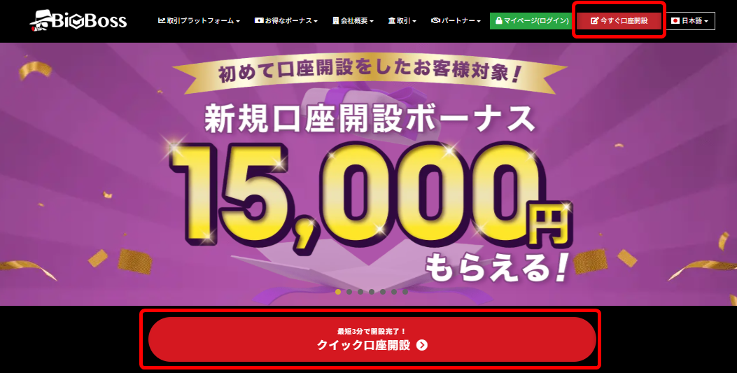 | 新規口座開設ボーナス | BigBossで新規口座を開設すると、15,000円分のボーナスクレジット(証拠金)がもらえる。入金不要で取引開始可能。 |